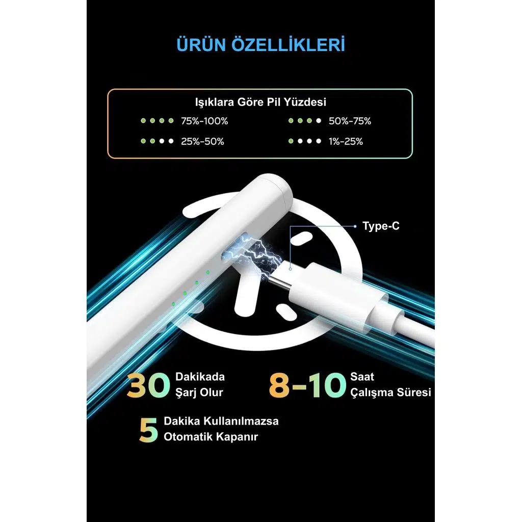 Uzun Bekleme Süresi: 30 dakikada tamamen şarj olur. Tamamen şarj olduğunda, Apple iPad kalemi 8-10 saat dayanır ve 1 aya kadar bekleme süresi sunar. Güç tasarrufu için 5 dakika hareketsiz kaldıktan sonra otomatik olarak kapanır.