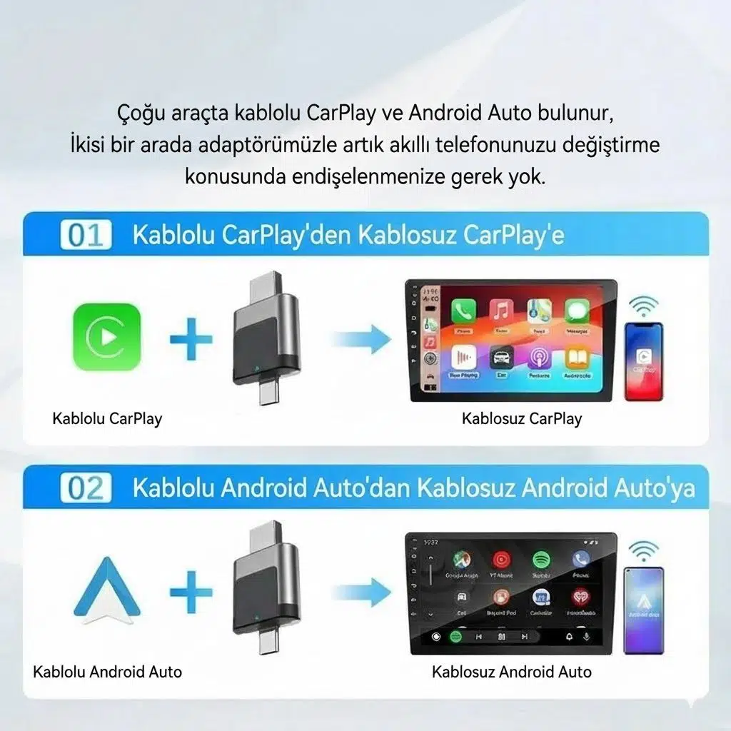 Adaptörü aracınızın USB veya Type-C portuna takmanız yeterli; sökme veya teknik beceri gerektirmez. Aracınızın orijinal bilgi-eğlence sisteminin performansını koruyan istikrarlı ve hızlı bir bağlantı sağlar.